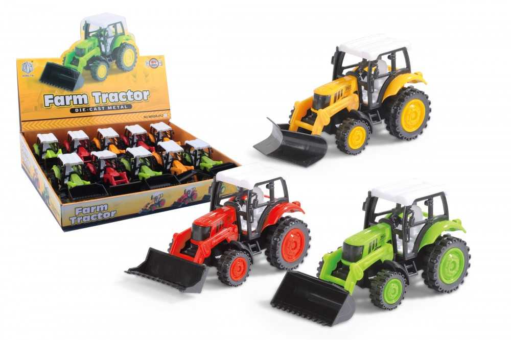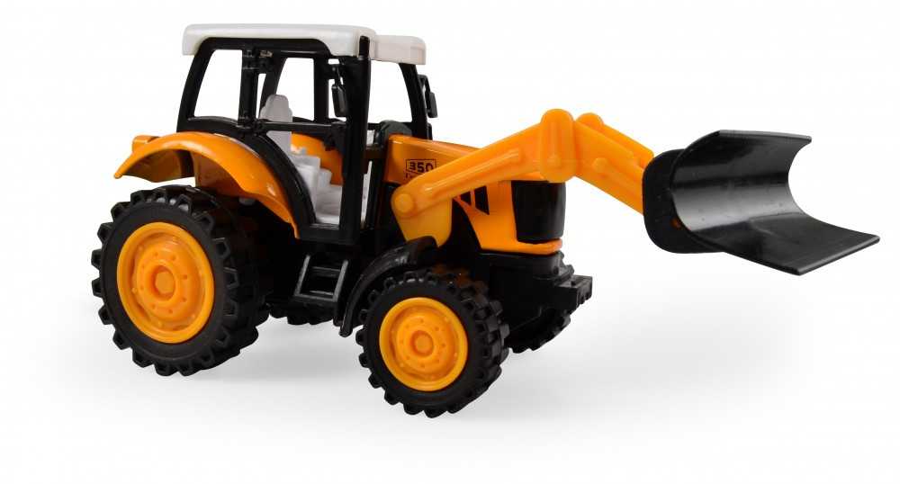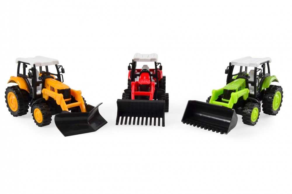 Hátra húzható traktorok többféle színben és kivitelezésben: sárga buldózer, piros markológép és zöld markológép. Az extra játékélményről a lendkerekek gondoskodnak, melyekkel könnyedén mozgásba lendülnek a munkagépek.