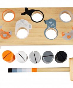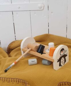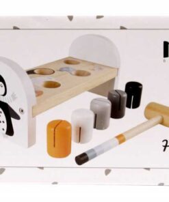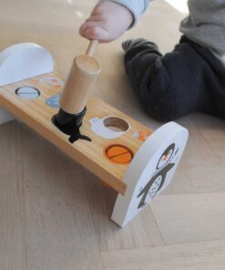 Gyönyörű és dekoratív kalapálós játék FSC minősített fából, pingvines mintával az oldalán. Klasszikus játék, amely erősíti a gyermek motorikus képességeit és a kéz és szem koordinációt.