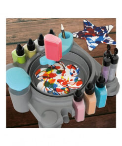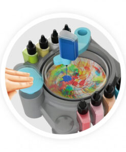 Helyezz egy papírlapot a forgó tálcára és tégy egy tubus festéket a benyúló tartóba. Egyik kezeddel nyomd meg a gombot a tálca elfordításához, a másik kezeddel mozgasd a benyúló kart, és nyomd össze a flakont, hogy a kívánt mennyiségű festék a képre csorogjon.