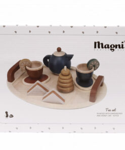 Fából készült magas minőségű teáskészlet tálcával és egyéb kiegészítőkkel. Tökéletes szerepjáték gyerekeknek, akik élvezik a játékkonyhát és a konyhai kiegészítőket.